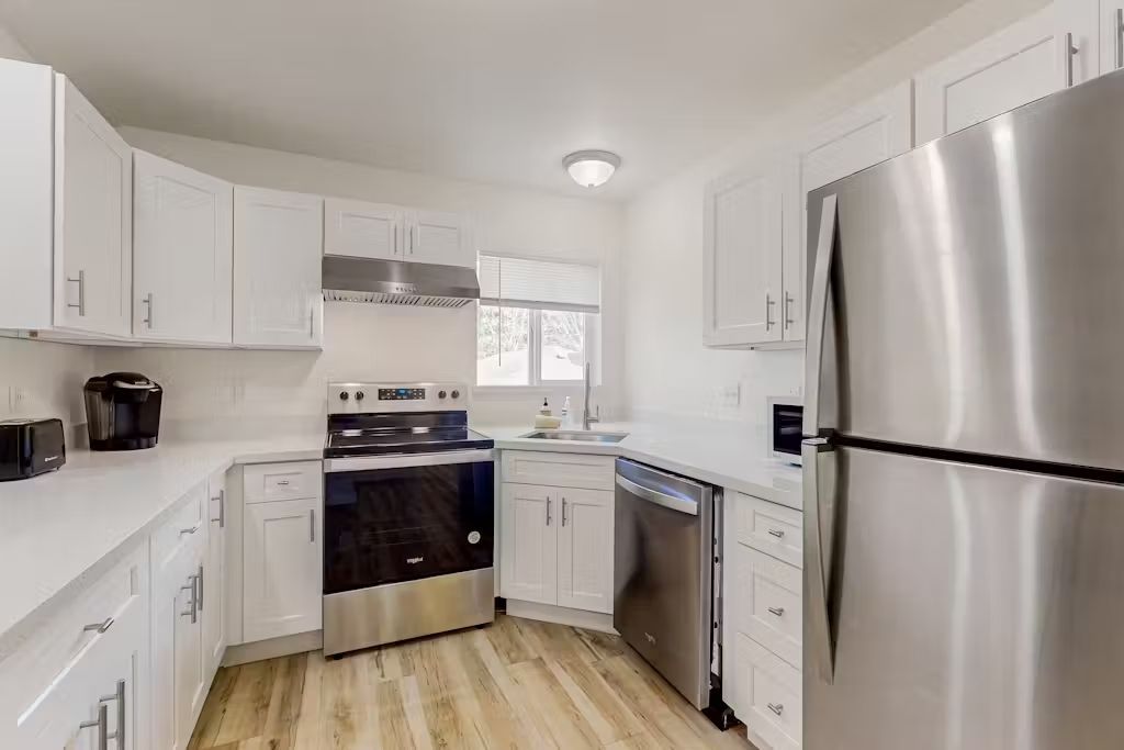 With one of the largest floorplans on the market, units feature two large bedrooms, two full bathrooms, open kitchen with dedicated dining space and separate great room. Luxury vinyl plank flooring throughout, new paint, brand-new stainless-steel appliances and new fixtures. Back patio flows into a grassy area with landscaping and fencing. Full height lockable storage unit accessible from back patio.